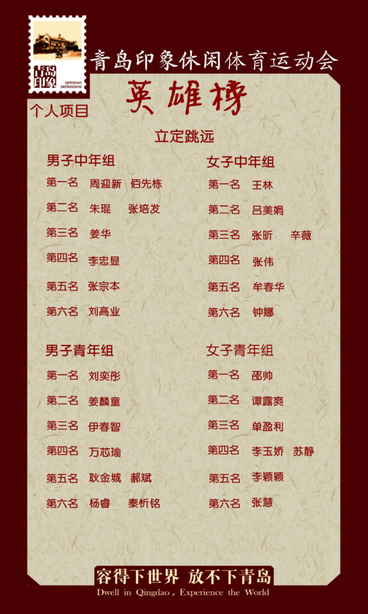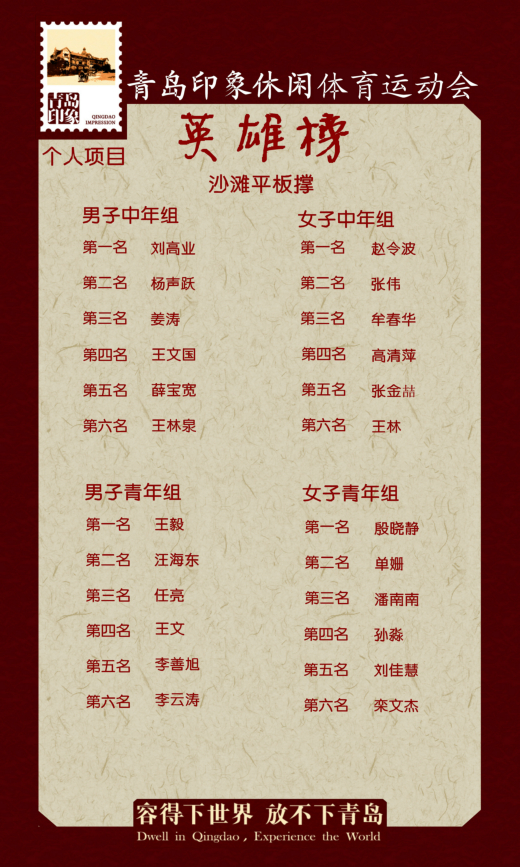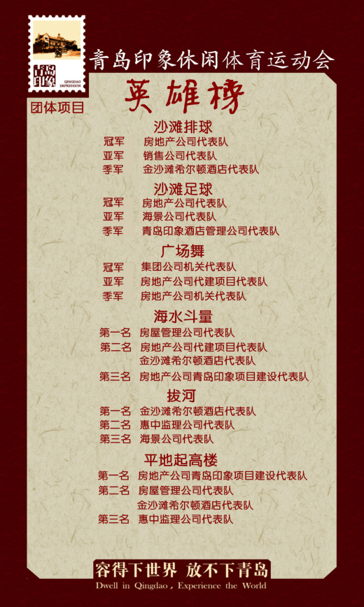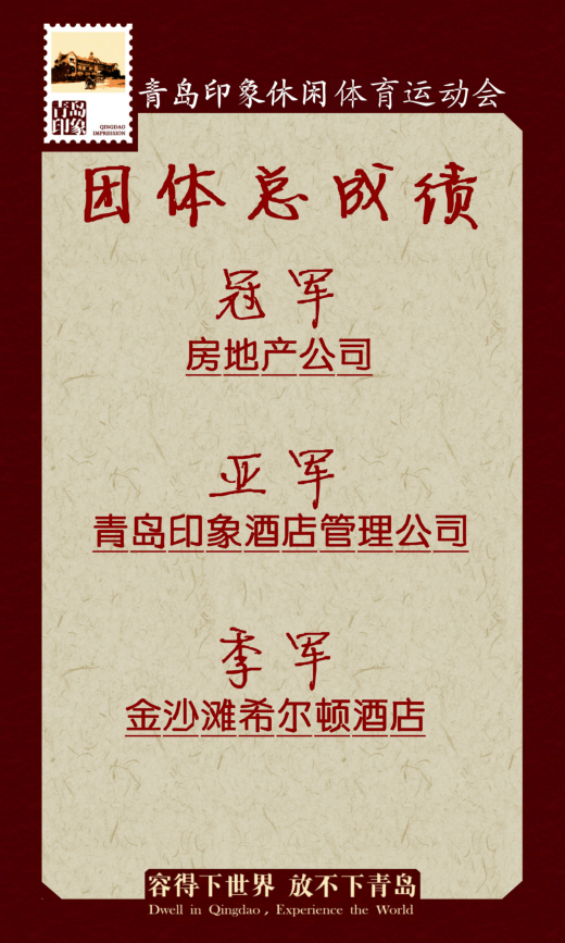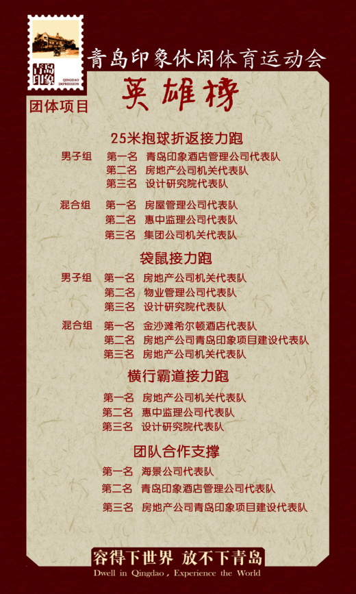十月金秋,碩果累累。在這個收獲的季節(jié),青島印象休閑體育運動會圓滿落幕了。在為期半天的比賽中,各公司成員相聚在美麗的金色海灘,參賽隊員團結(jié)協(xié)作、頑強拼搏,場上激情洋溢,歡聲四起。運動員們賽出了風(fēng)格,賽出了水平,也增進了公司內(nèi)部以及各公司間的交流協(xié)作與團隊建設(shè),充分發(fā)揚了青島城建人敢拼、善戰(zhàn)、團結(jié)一致的精神,取得了一個又一個的好成績。在此發(fā)布本次運動會英雄榜,對取得優(yōu)秀成績的各位運動員與各單位表示祝賀!