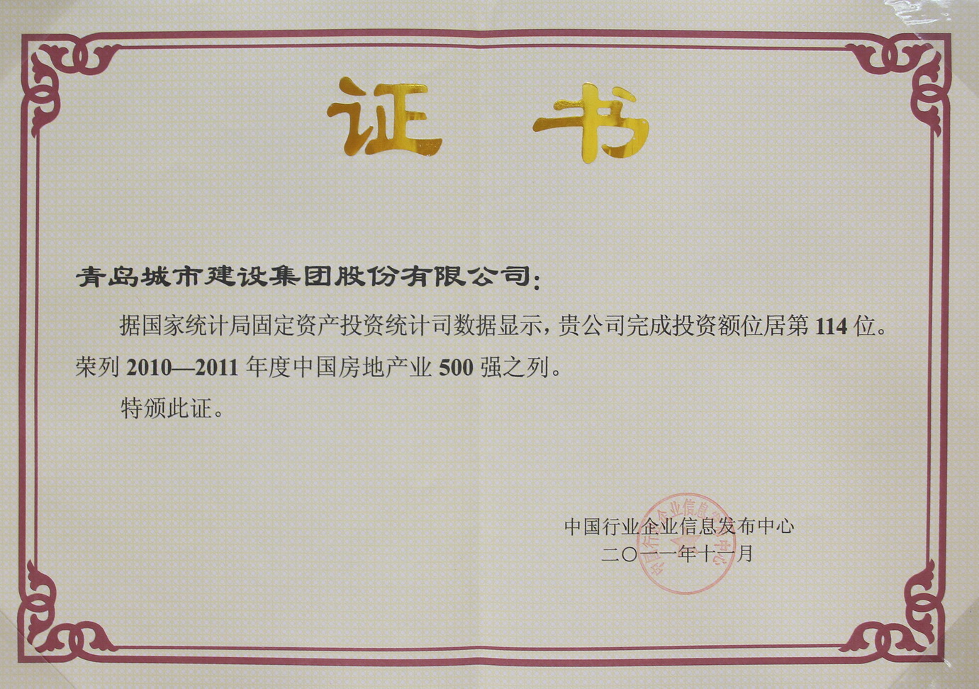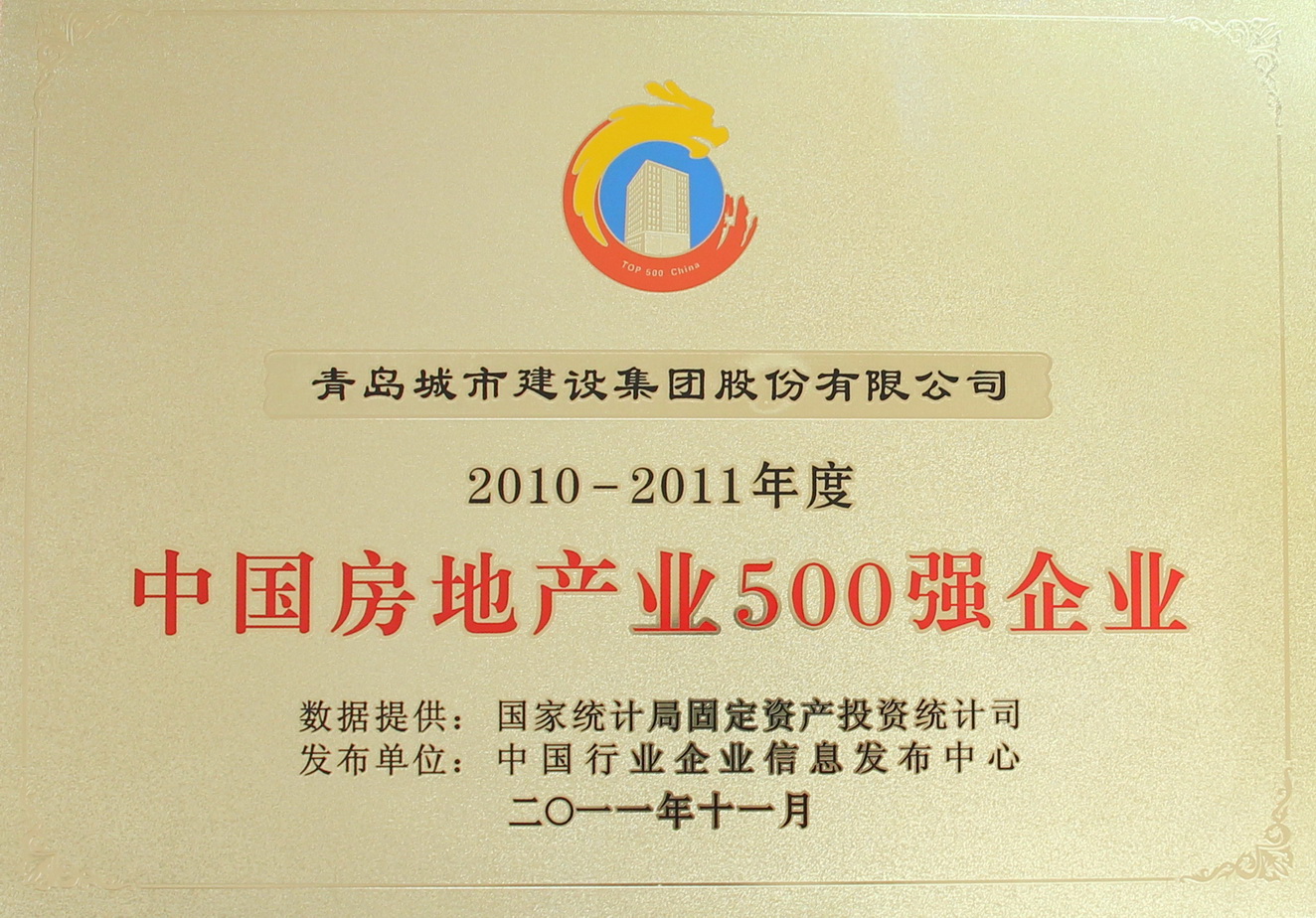 2011年11月5日在北京人民大會(huì)堂,由國(guó)家統(tǒng)計(jì)局中國(guó)行業(yè)企業(yè)信息發(fā)布中心主辦的第十屆中國(guó)大型房地產(chǎn)與建筑業(yè)500強(qiáng)企業(yè)信息發(fā)布會(huì)上,青島城市建設(shè)集團(tuán)再次躋身中國(guó)房地產(chǎn)企業(yè)500強(qiáng)前列,完成投資額位居全國(guó)第114位。