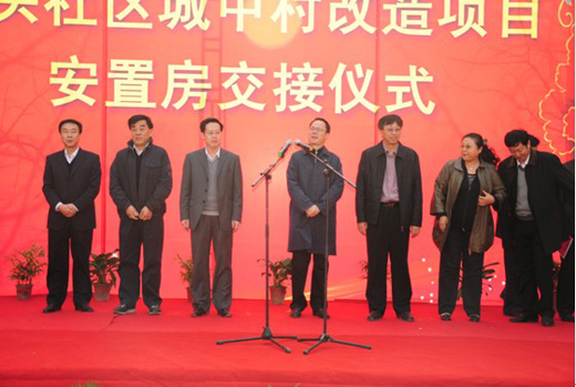 (李滄區(qū)張杰區(qū)長(zhǎng)、市房地產(chǎn)開發(fā)管理局丁偉局長(zhǎng)以及各有關(guān)部門負(fù)責(zé)同志共同出席灣頭社區(qū)改造項(xiàng)目一期安置房交接儀式)