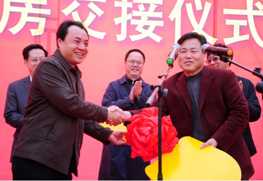 (青島城市建設(shè)集團(tuán)房地產(chǎn)開發(fā)有限公司總經(jīng)理李忠顯向?yàn)愁^社區(qū)居委會(huì)黨支部書記王修山交接安置房屋鑰匙)